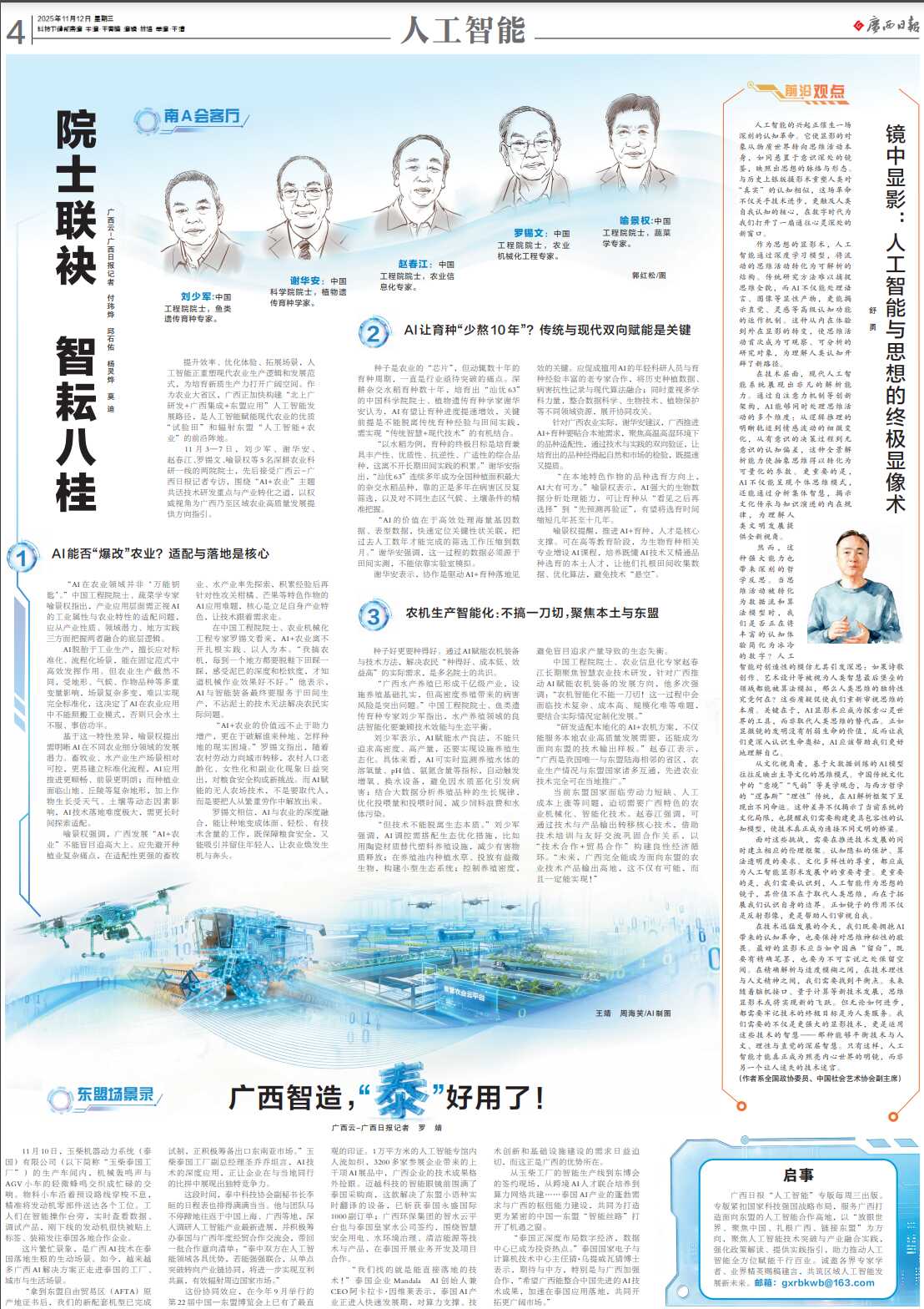 “研发适配当地化的AI+农机方案,正在AI解析框架下呈现出分歧命运。无效辐射周边国度市场。让农业焕发朝气取奔头。环绕“AI+农业”从题共话手艺研发沉点取财产之道,刘少军、谢华安、赵春江、罗锡文、喻景权等5名深耕农业科研一线的两院院士,广西成长“AI+农业”不克不及盲目逃高峻上。通过自留意力机制等立异架构,”